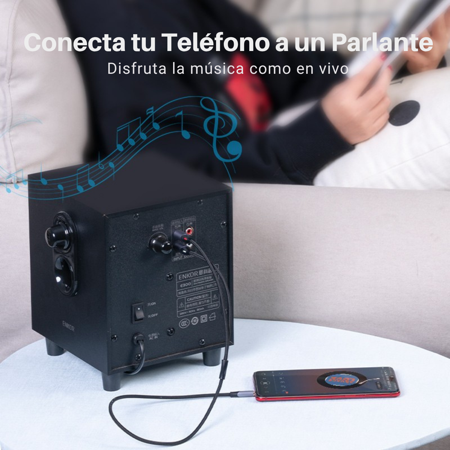 El práctico cable adaptador incluye dos conectores macho RCA en un extremo y un conector macho de 3,5 mm en el otro. Los conectores macho RCA se adaptan a entradas de audio a, mientras que el conector macho de 3,5 mm funciona con dispositivos con una entrada estándar auxiliar de 3,5 mm (usada normalmente para auriculares).