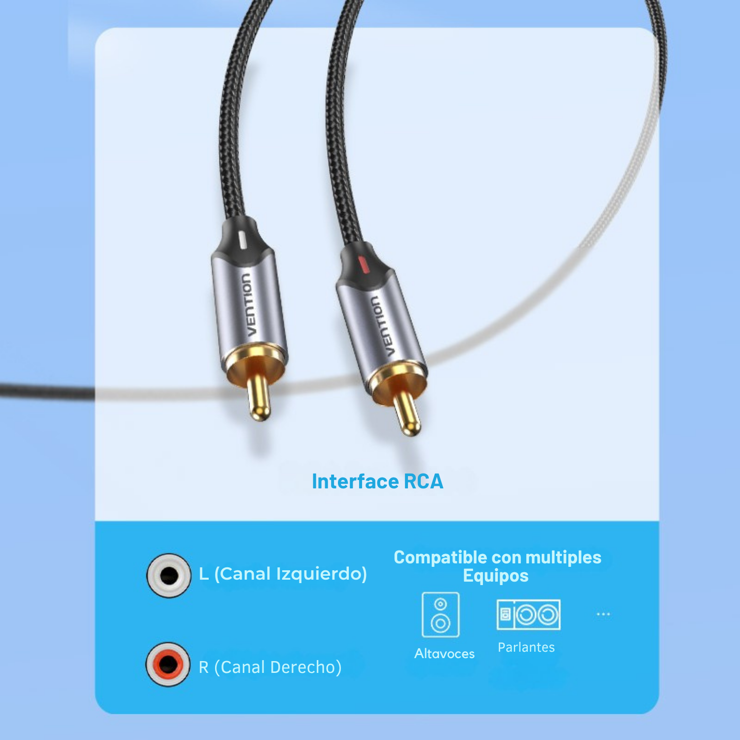 Experimenta no solo un sonido estéreo de alta calidad, claro y transmitido a la perfección, sino también una fiabilidad constante y una mínima pérdida de señal. El cable adaptador de 3,5 mm a 2 machos RCA de Vention cuenta con un conector de 3,5 mm chapado en oro resistente a la corrosión y capucha de aluminio, asegurando que durara en el tiempo.