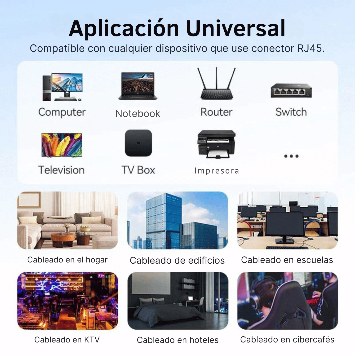 Compatible con cualquier dispositivo que utilice puerto RJ45: computadores, notebooks, routers, impresoras, Smart TVs, consolas y más.