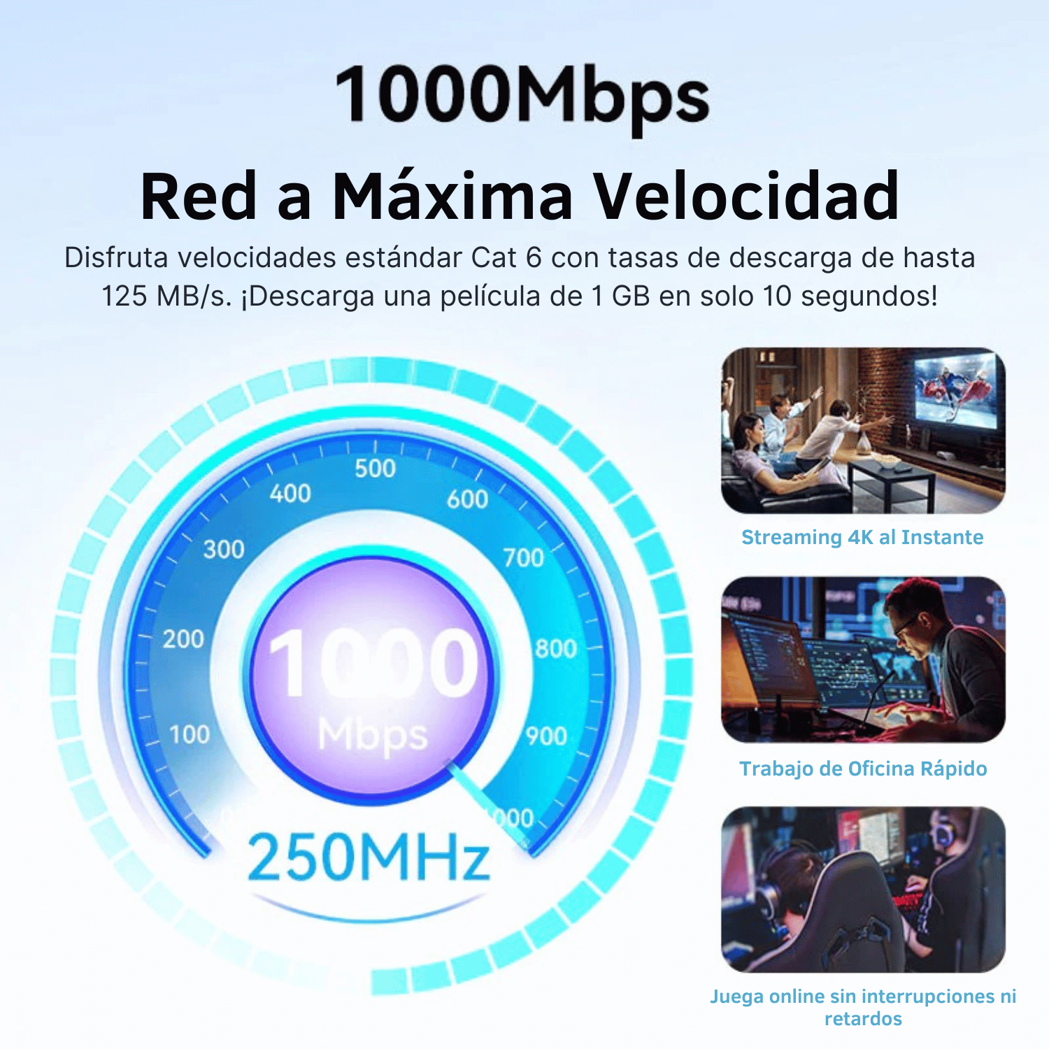 Diseñado para alcanzar velocidades de hasta 10 Gbps y un ancho de banda de 250 MHz, este cable es ideal para transmisión de datos, videollamadas, juegos en línea y streaming en 4K sin interrupciones.