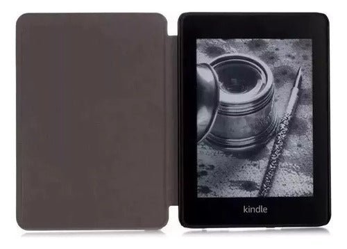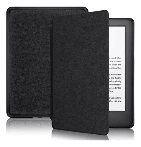 Incluye una funda con cierre magnetico con color a eleccion (la funda no es compatible con carga inalambrica) . Al abrir la funda el kindle se desbloquea, y al cerrar se bloquea. Tambien incluye un protector de pantalla con terminacion mate, especial para el kindle.